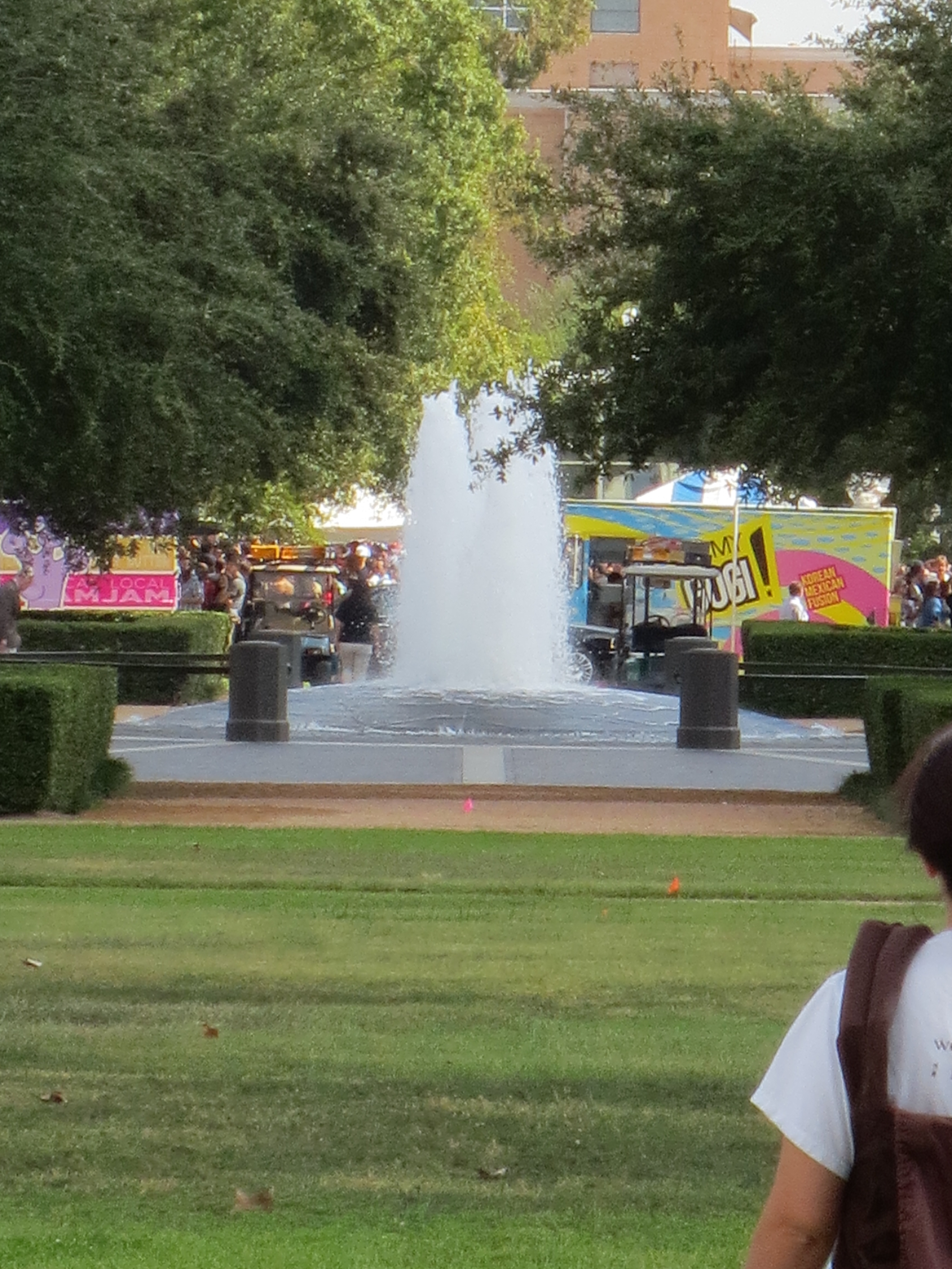 The fountain is in the courtyard of the new business school buildings. And in the distance you can see the food trucks that gathered for a Centennial lunch for all.